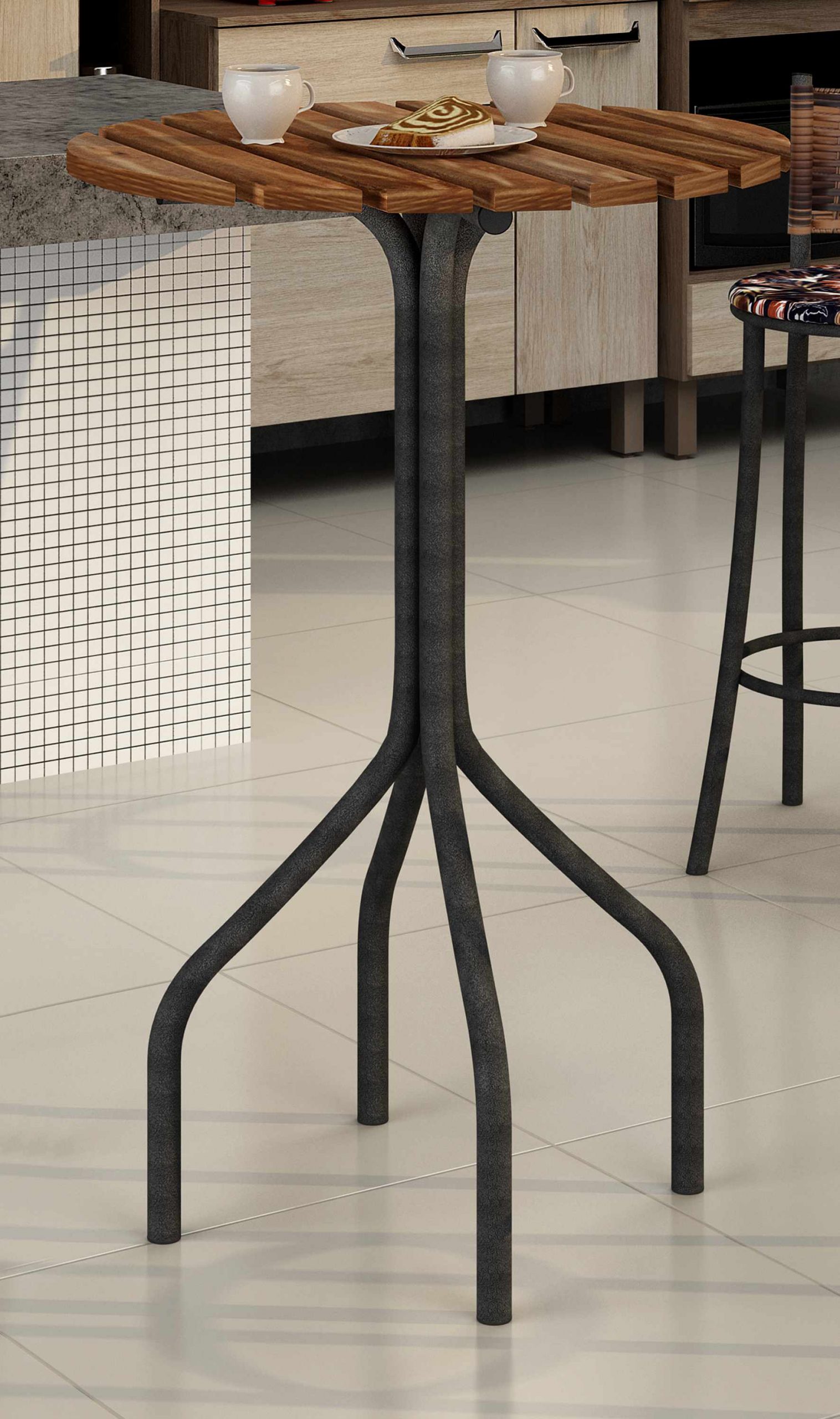 Mesa de Bar Goias, Côr Martelado Cinza, Moveis Teixeira, Medidas: Alt 1,00m Larg 0,60m Prof 0,60m, Estrutura em Tubos de Aço Carbono com Pintura Epoxi Martelado Cinza, Tampo de 60cm de Diametro em Madeira Ripada na Côr Carvalho.(PODE FAZER CONJUNTO COM OS TAMBORETES DUBAI OU PANAMÁ).
