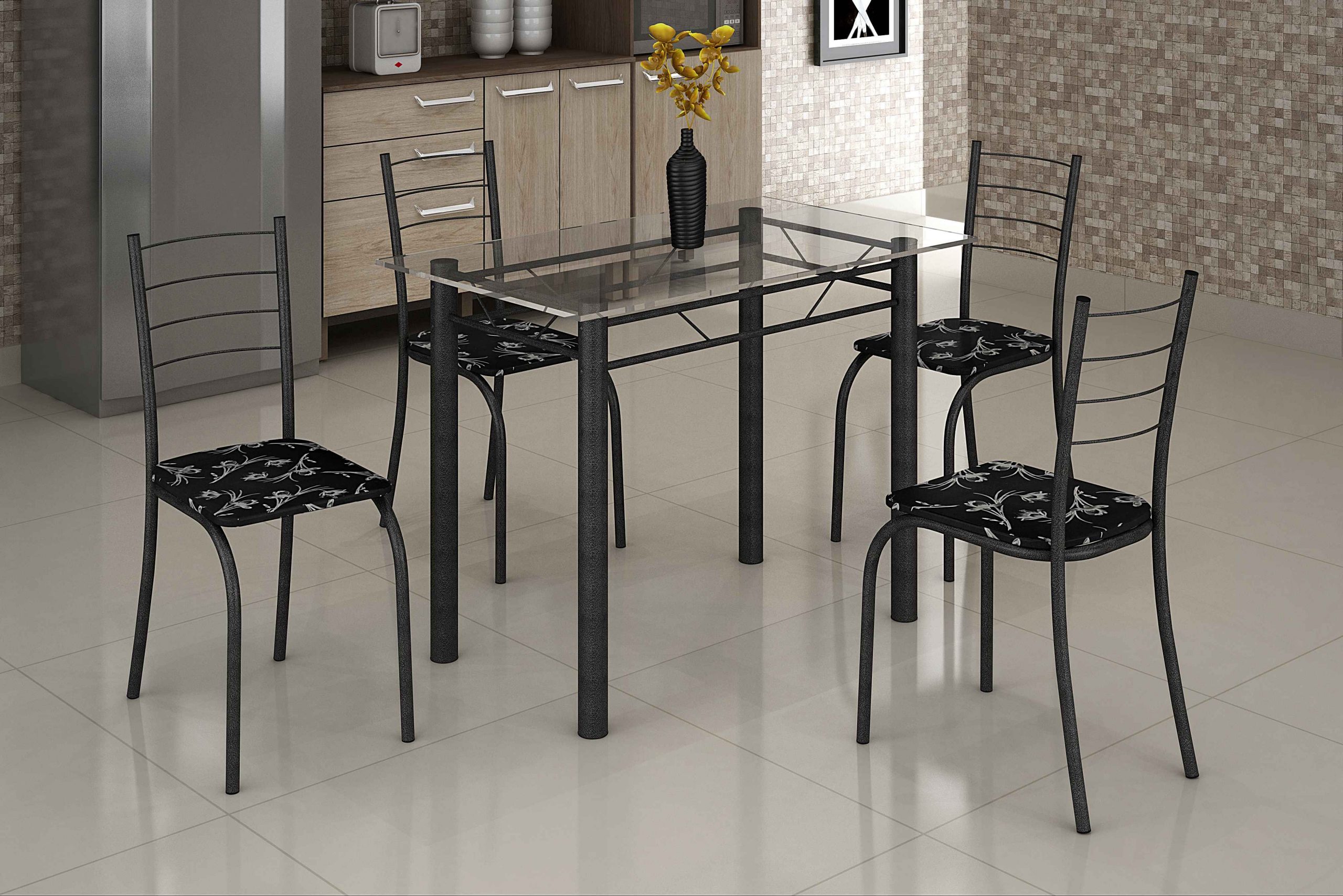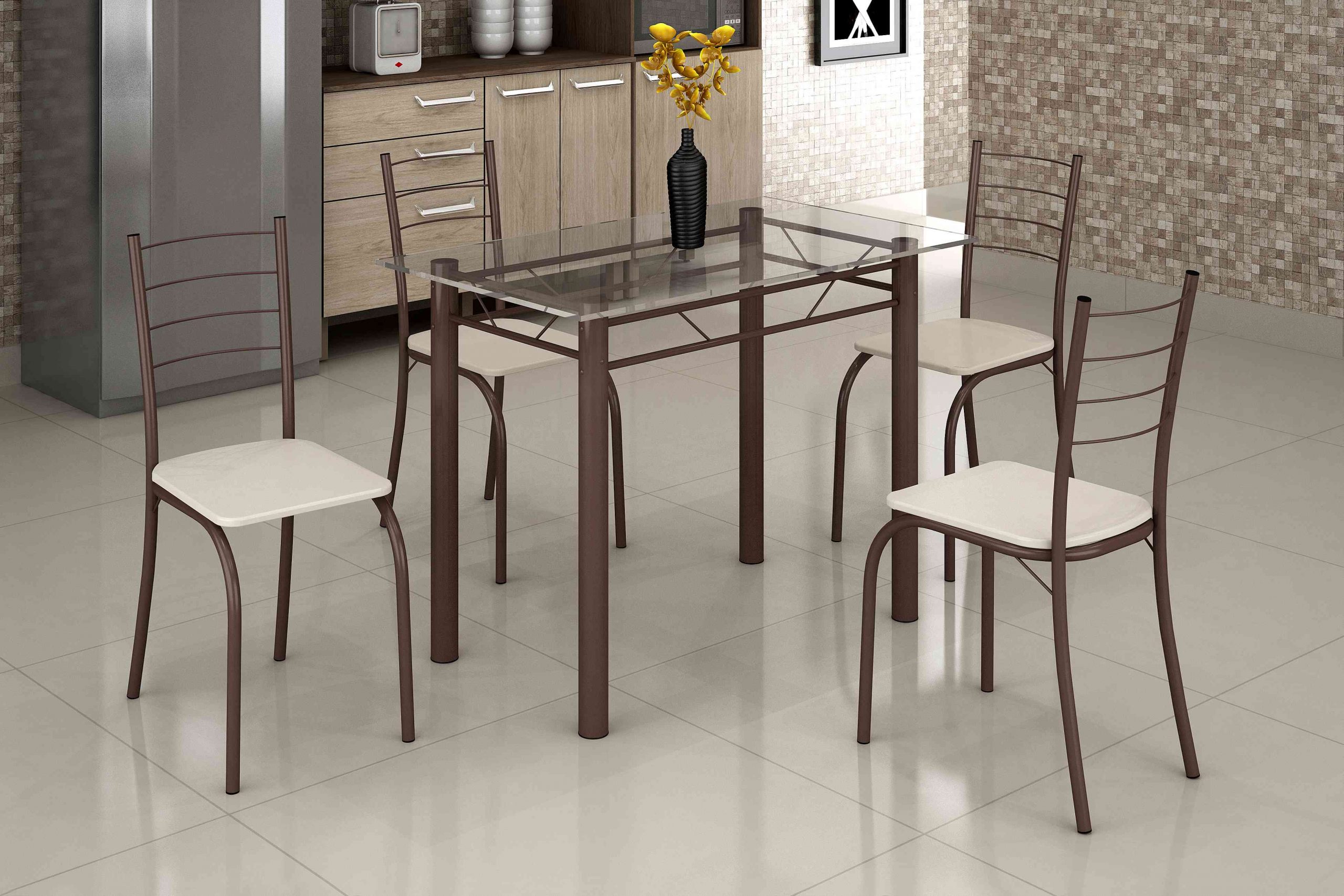 Conjunto de Mesa Rio, Côr Marrom, da Tubulares Teixeira, Medidas: Alt 0,85m Larg 0,60m Prof 1,00m, Estrutura em Aço Carbono Pintado com Tinta Epoxi, com Tampo de Vidro, 4 Cadeiras com Estofamento em Corino Creme.