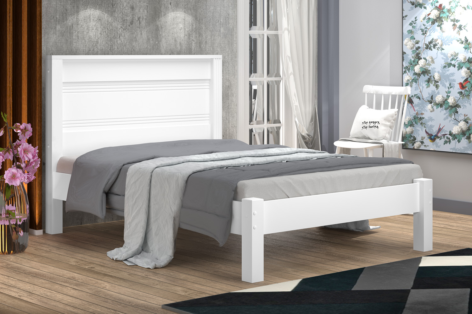 Cama Casal Aline Nova, Côr Branco, da Luke Móveis, Medidas: Alt 1,17m Larg 1,43m Prof 2,05m – Pés 7,5×7,5cm, Estrutura e estrado em MDF.