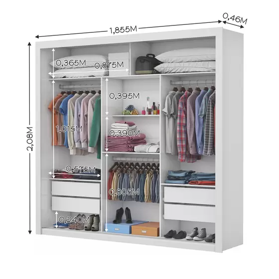 Alt.: 208cm – Larg.: 185cm – Prof.: 46cm – 4 gavetas – 3 portas de correr -estrutura em MDP