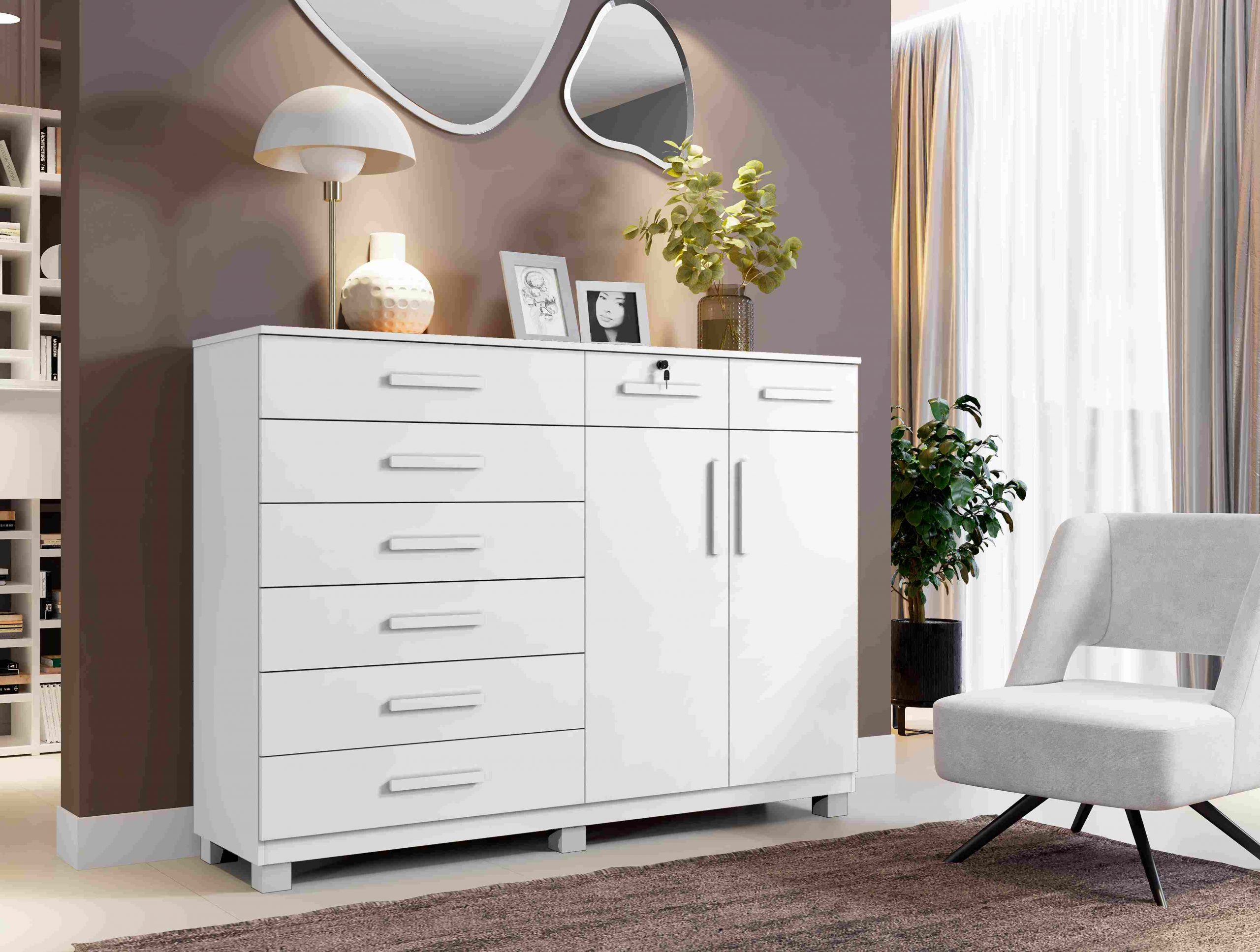 Cômoda New Triunfo, Côr Branco, da Benetil, Medidas: Alt 1,37m Larg 1,48m Prof 0,45m – Estrutura 100% MDP 15mm – Tampo MDP 25mm, 8 Gavetas com Corrediças Telescópicas, sendo uma com Chaves, 2 Portas com Dobradiças Metalicas, 2 Prateleiras Internas e Puxadores de MDF