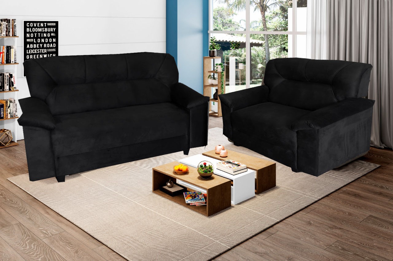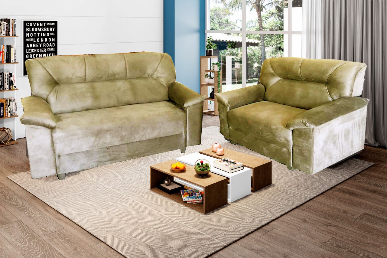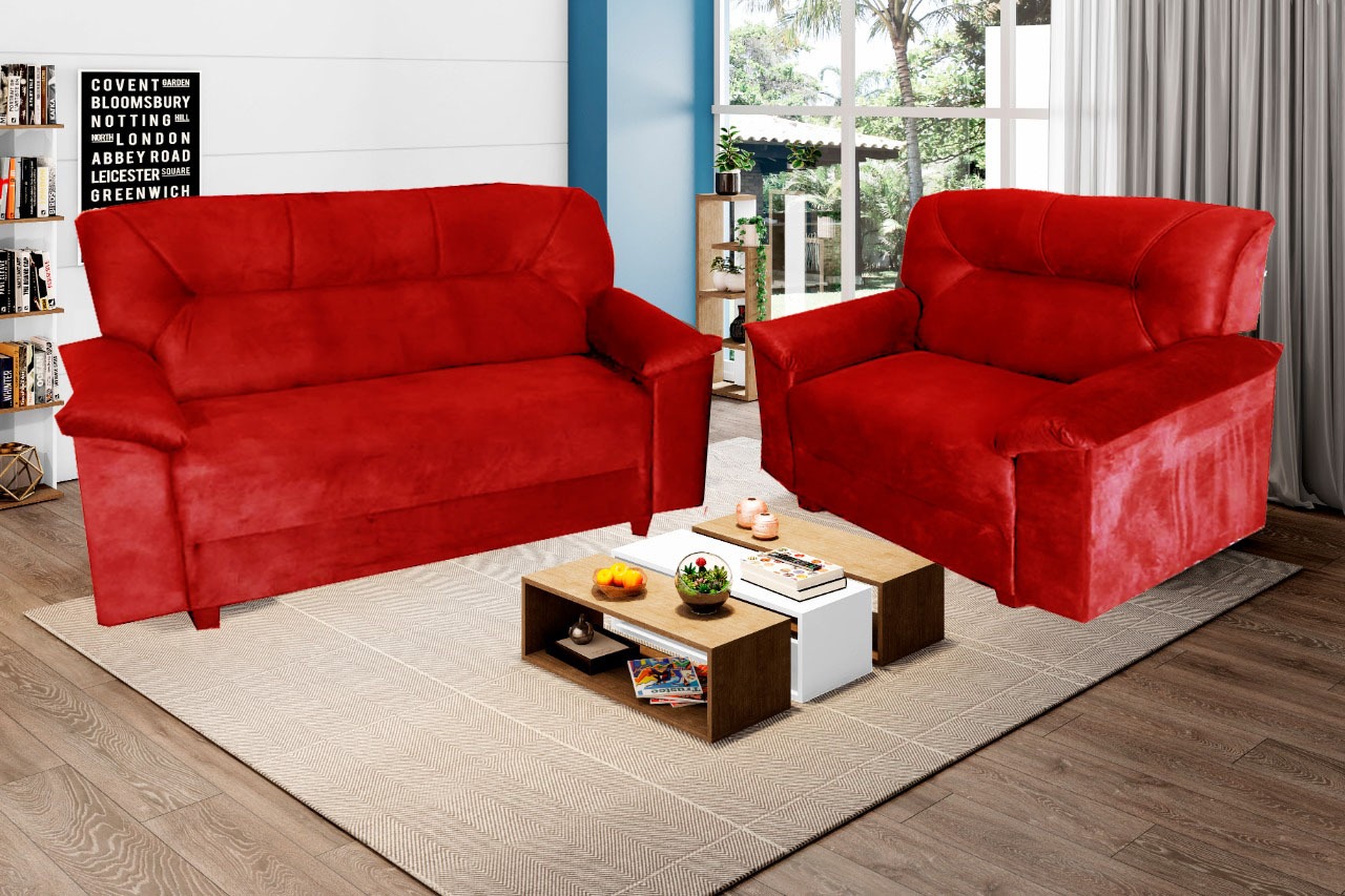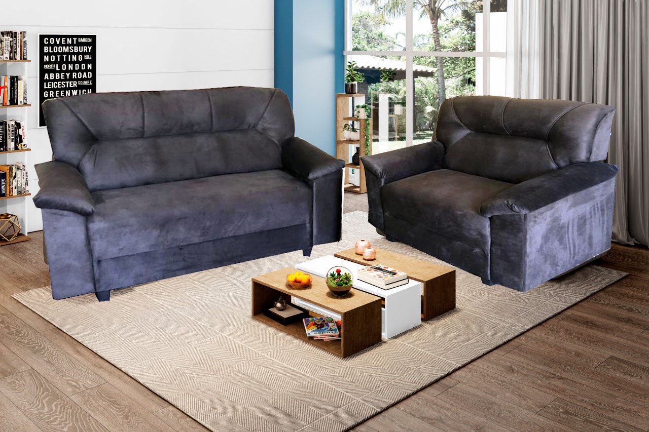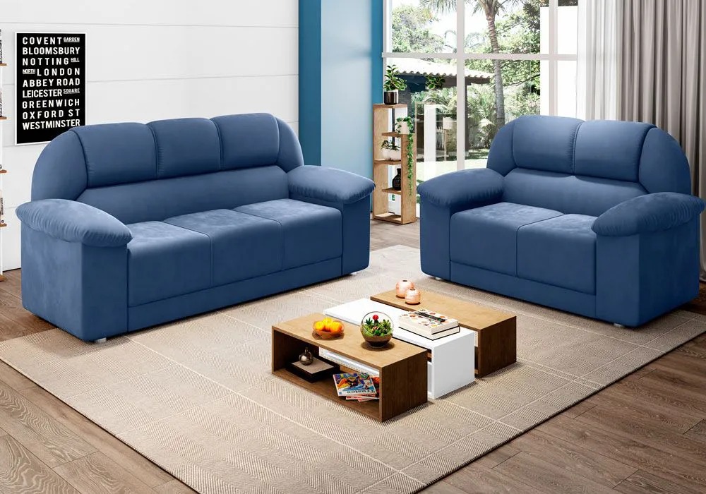 Conj Estofado Bilbao 2 e 3 Lugares, em Suede Pena, Côr Azul, Medidas: A 0,98m L: 2Lgs 1,30m 3Lgs 1,72m P: 0,70m, Estrutura em Eucaplito, Percintas Elásticas e Espuma D23 nos Assentos, Almofadas com Fibras Mescladas com Flocos, braços em Espuma D20.