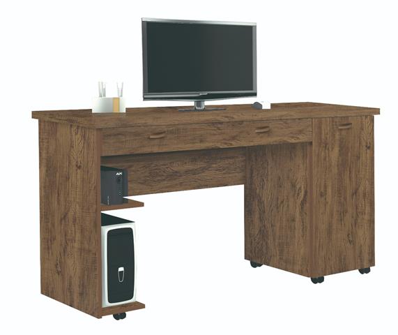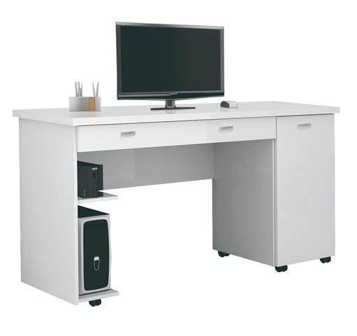 Escrivaninha Ariel, Côr Branco, da Móvies Primus, Medidas: Alt 0,785m Larg 1,365m Prof 0,445m, com 1 porta, 1 gaveta, espaço para gabinete e estabilizador e pés com rodízios.