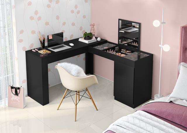 Escrivaninha Penteadeira de Canto Star, Côr Freijó/Off White, da Mobler, Medidas: Alt 0,75m Larg 1,36m/Alt 1,18m Lasrg 1,36m, com espelho, nincho organizador com tampas de vidro e armário com porta de bater e prateleira interna.