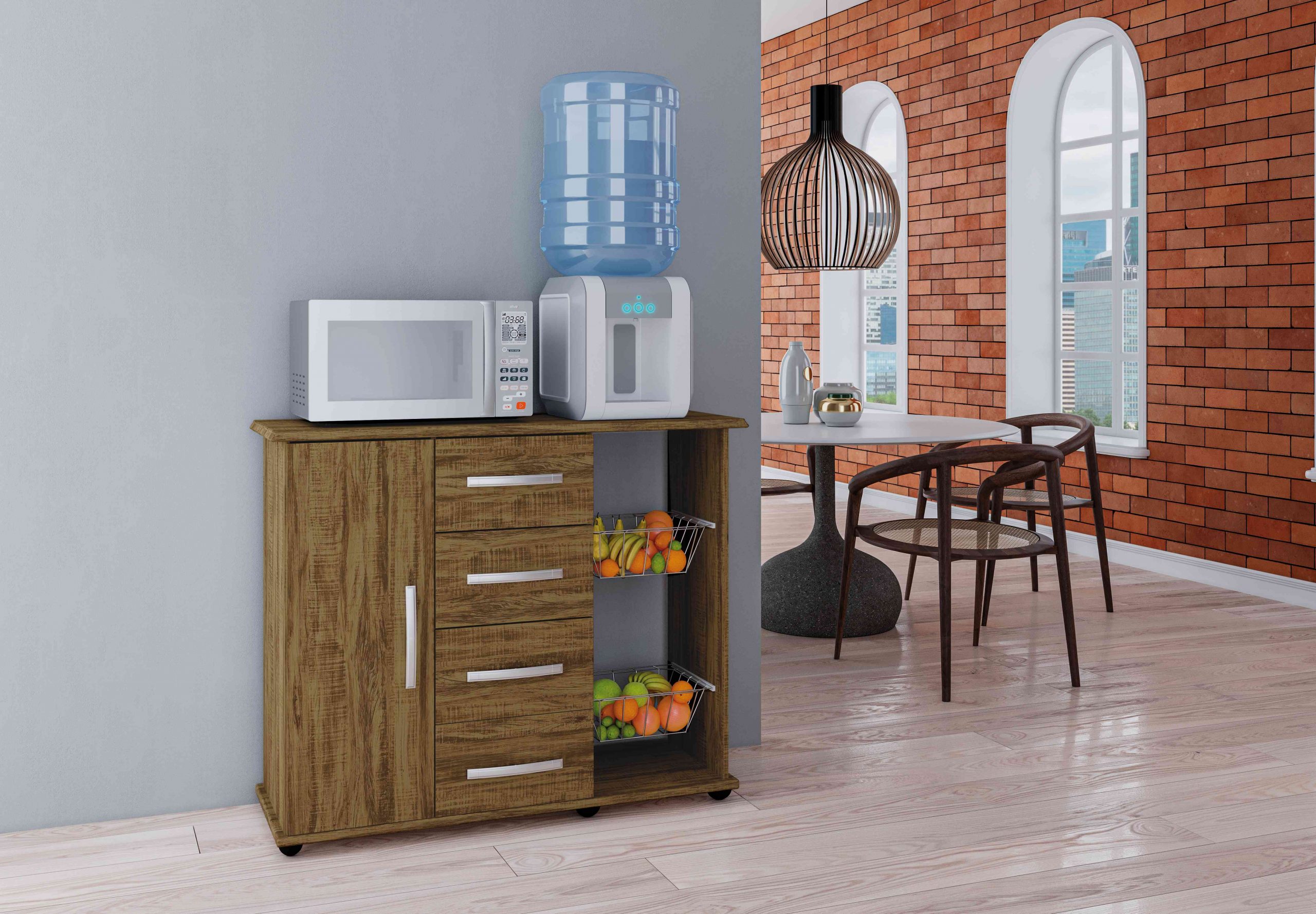 Fruteira Camila, Côr Amêndoa Wood, da Primus, Medidas: Alt 0,88m Larg 1,00m Prof 0,385m, Estrutura 100% MDP 15mm e 12mm, Tampo Fresado de MDP 15mm, 4 Gavetas com Corrediças Metálicas, 1 Porta de Bater com Dobradiças Metálicas, 1 Prateleira Interna, 2 Cestos de Aço com Trilhos em PVC, Puxadores Plásticos Metalizados e Rodízios.