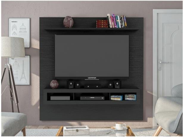 Home Suspenso Porto Belo 1.8, Côr Preto Texturizado, da Caemmun, Medidas: Alt 1,80m Larg 1,80m Prof 0,34m, Estrutura em MDP com chapas de 12mm, 15mm, 25mm, 2 prateleiras e 3 nichos para eletroeletrônicos, Para TVs até 60 polegadas.