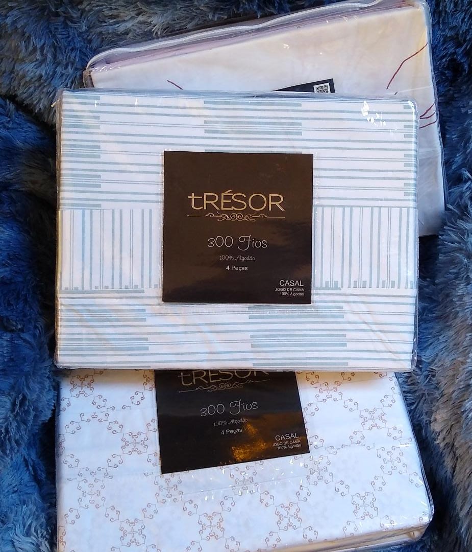 Jogo de Cama Lençóis Trésor Fios, Tamanho Casal, 300 Fios, 100% Algodão, com 4 Peças: 1 Lençol com dobra dupla 2,20m x 2,47m, 1 Lençol com elastico 1,40m x 1,90m x 0,30m e 2 Fronhas com Abas 0,50m x0,70m.