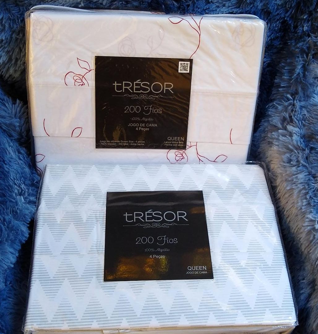 Jogo de Cama Lençóis Trésor, Tamanho King Sizse, 300 Fios, 100% Algodãom, com 4 Peças: 1 Lençol com dobra dupla 2,47m x 2,80m, 1 Lençol com elastico 1,93m x 2,00m x 0,40m e 2 Fronhas com Abas 0,50m x0,70m.