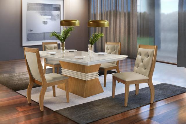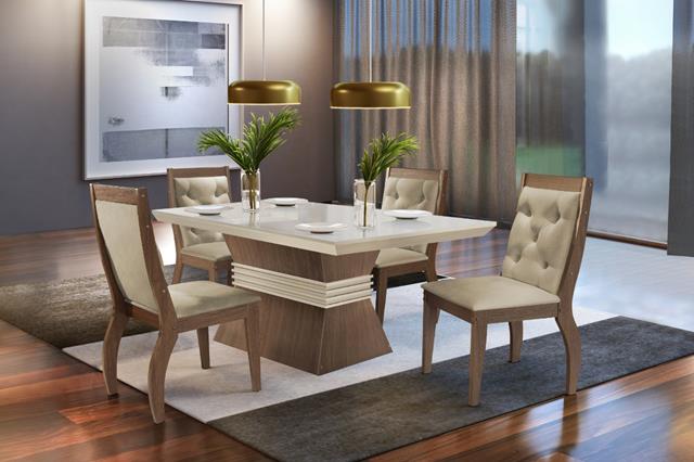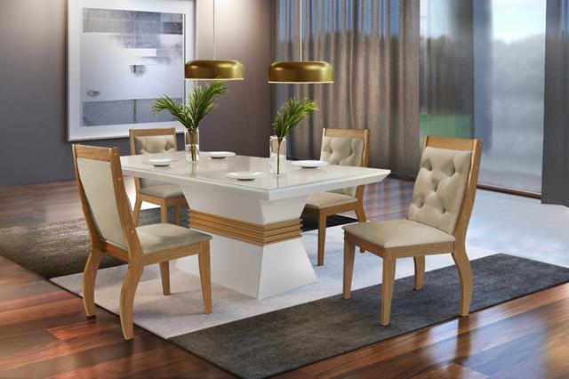 Conjunto de Mesa Agata, da Rufato Moveis, Cor: base OffWhite, detalhe cafe, 4 cadeiras Agatas, medida mesa: alt.:0,80m, larg.:1,20m, prof.:0,80m; medida cadeira: alt.:1,02m, larg.:0,56m, prof.:0,44m, tecdio Turin 07.