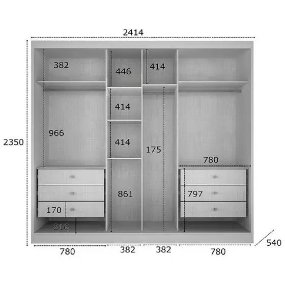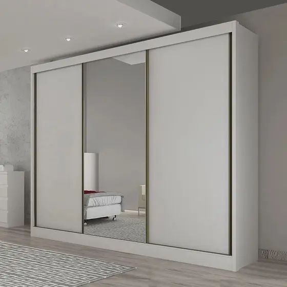 Alt.: 236,4cm – Larg.: 241,4cm – Prof.: 55,5cm – 6 gavetas – 100% MDF – Espelho com película de