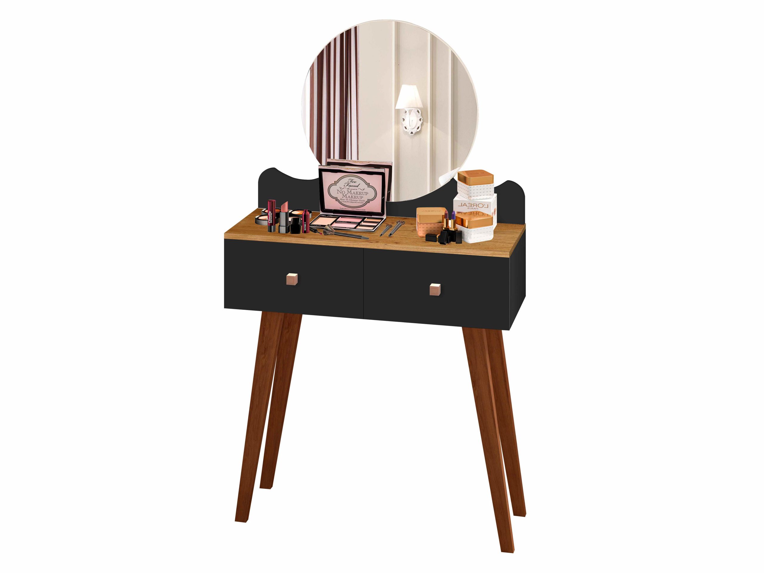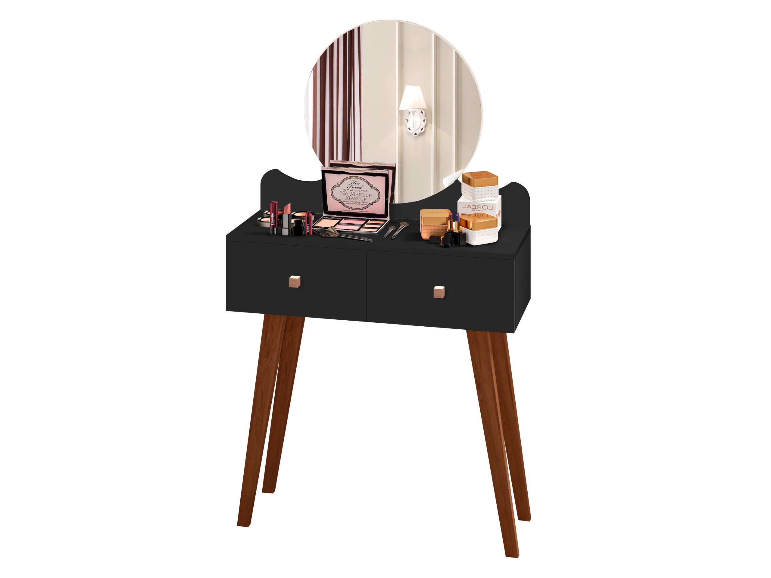 Penteadeira Condessa com Espelho, Côr Branco, da Maria Móveis, Medidas: Alt 1,37m Larg 0,82m Prof 0,34m, Estrutura em MDP com Tampo em MDF, 2 Gavetas com Corrediças Metálicas e Pés Palitos de Madeira Maciça.