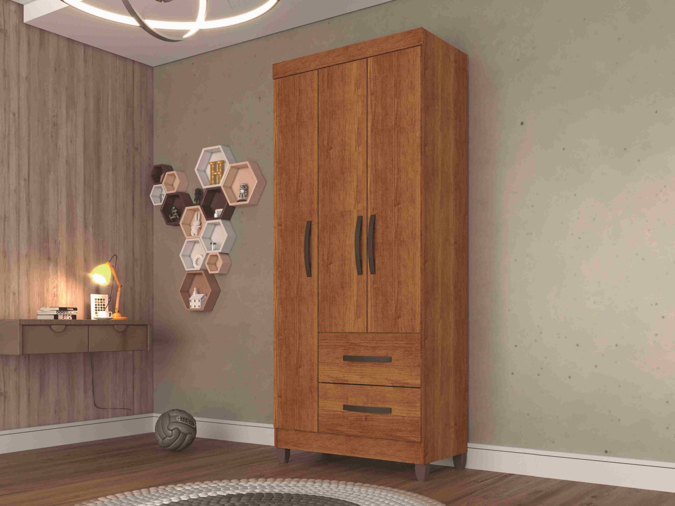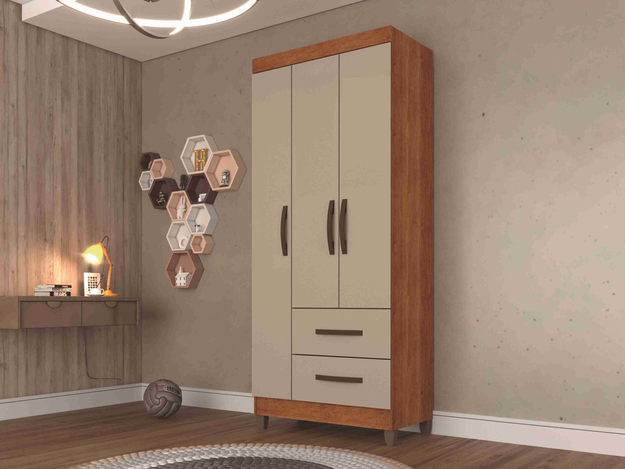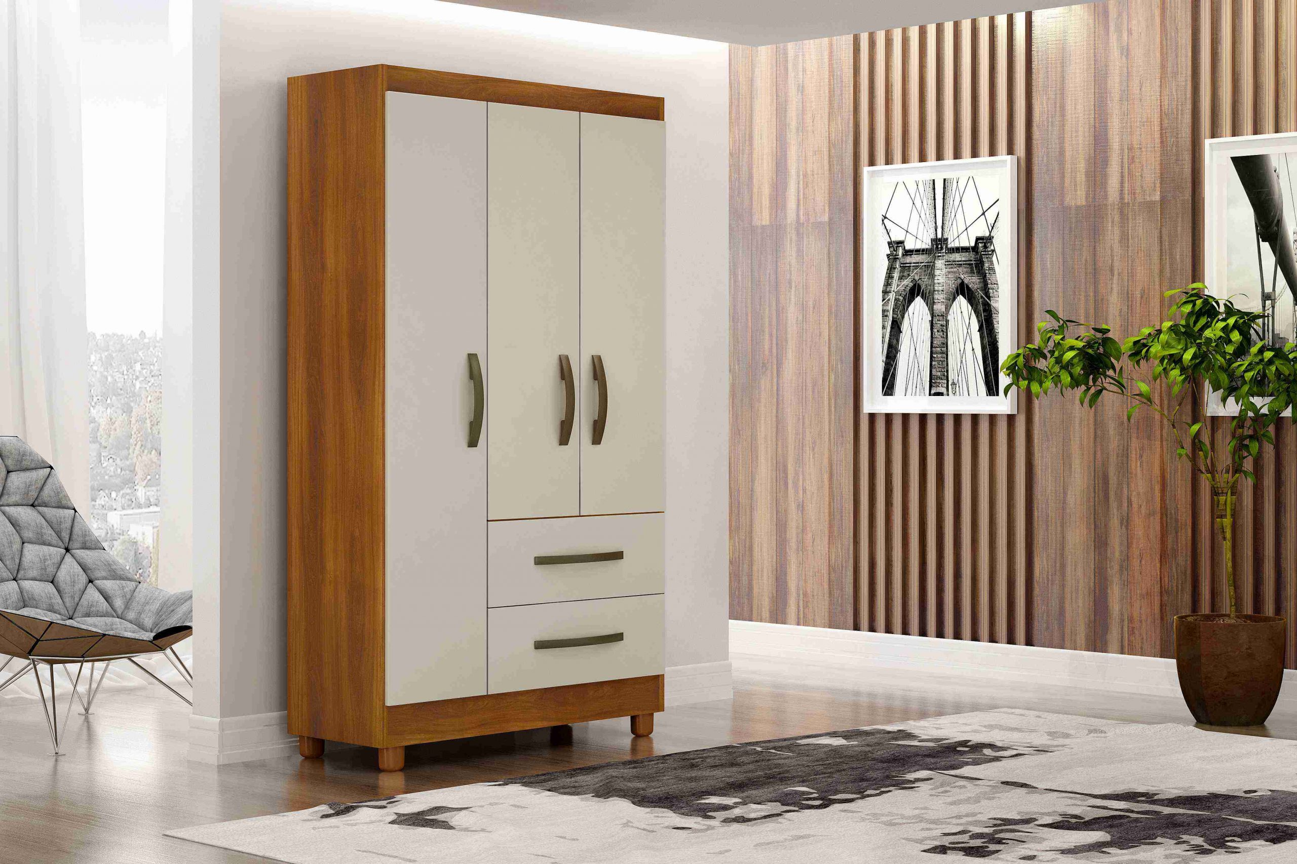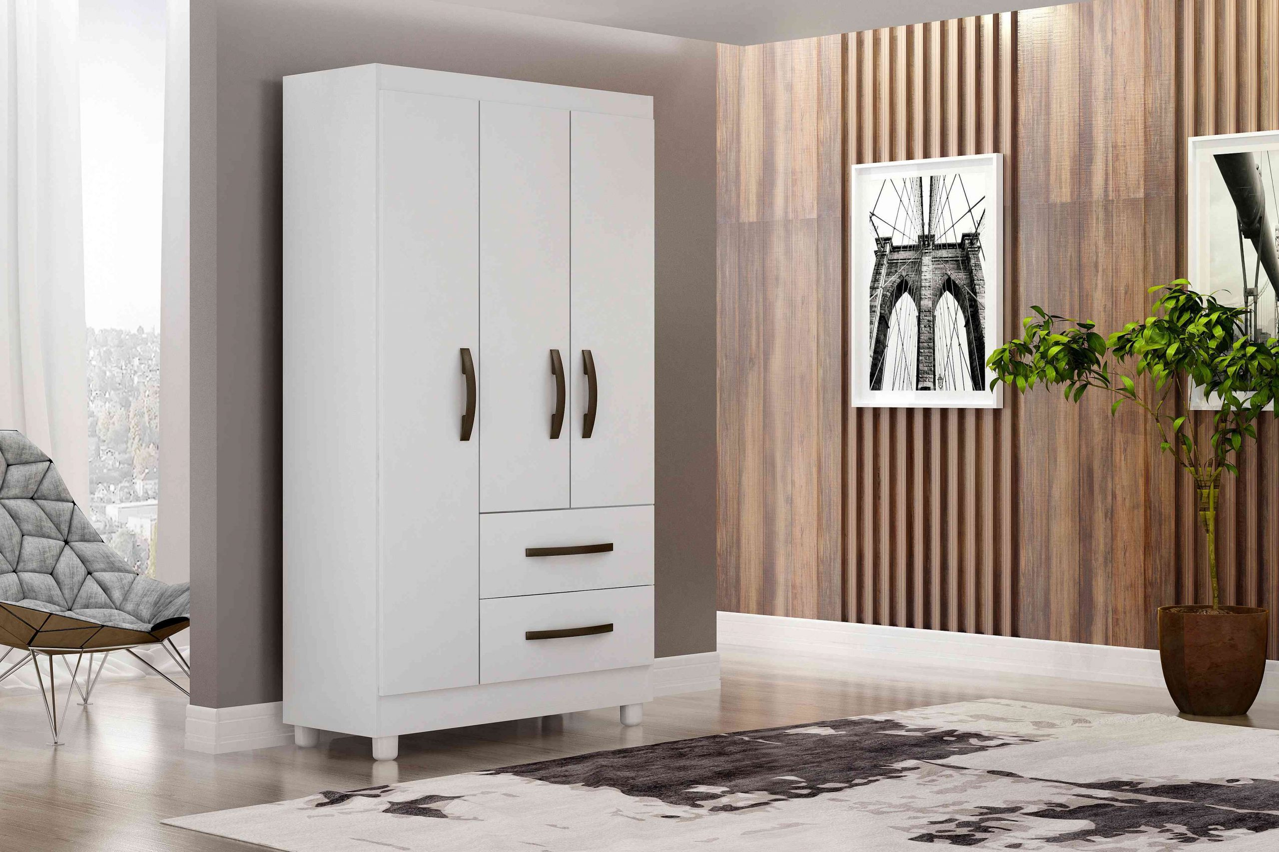 Roupeiro Estrela 3P2G, Côr Branco, da Salleto, Medidas: Alkt 1,80m Larg 0,756m Prof 0,40m, Estrutura 100% MDP, 3 Portas de Bater com Dobradiças Metálicas, 2 Gavetas com Corrediças Metálicas – Peso Máximo 5Kg, 2 Prateleiras Internas – Peso Máximo 7kg, 1 Cabideiros – Peso Máximo 15Kg, Puxadores Plásticos Metalizados de PCV e Pés Plásticos de 7cm. (Kit de Espelhos Opcional)