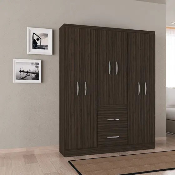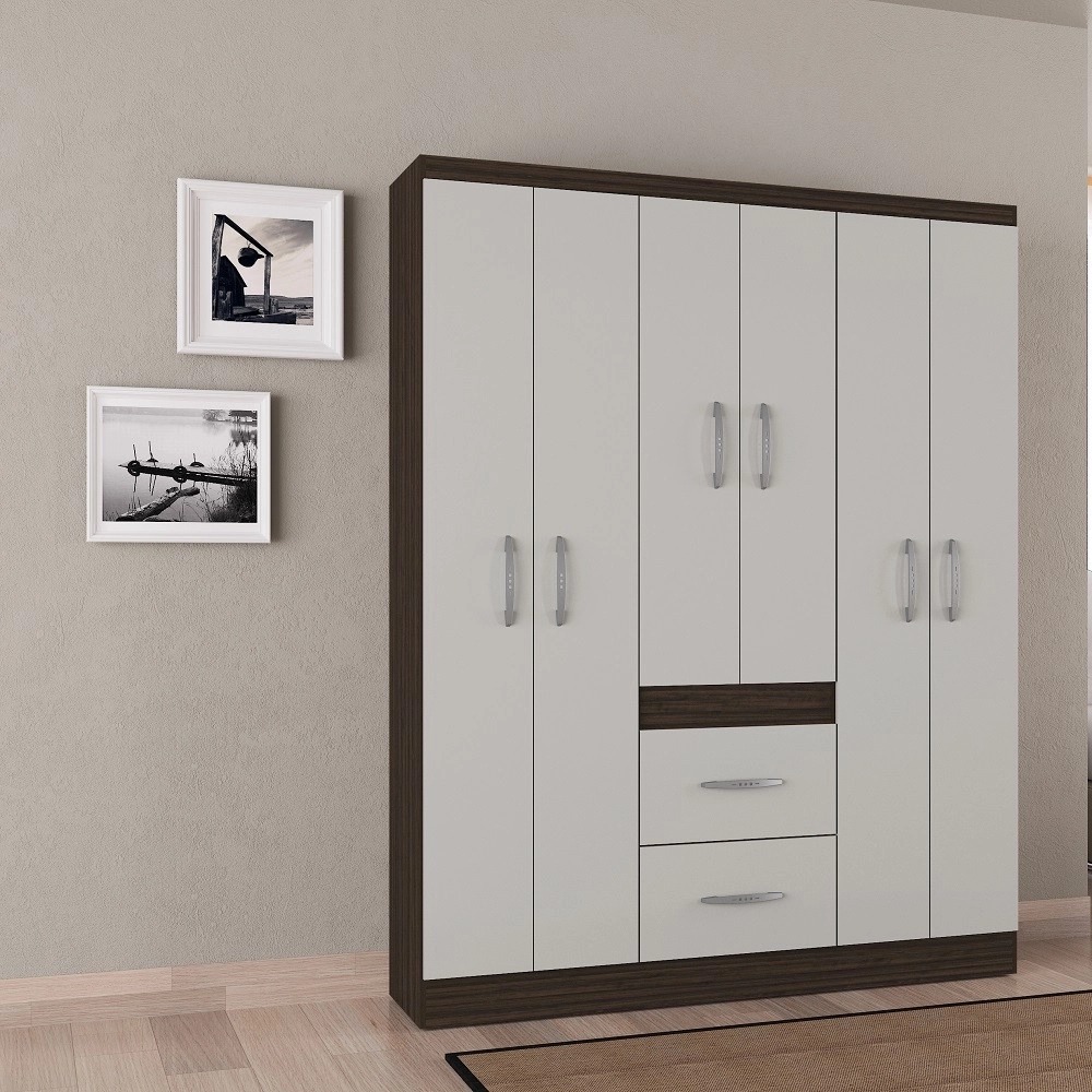 Roupeiro New Marbela 6P2G, Côr Chocolate/Off White, da Poquema, Medidas: Al 1,75m Larg 1,35m Prof 0,365m, Estrutura 100% MDP de 12mm, 6 Portas de Bater com Dobradiças Metálicas, 2 Gavetas com Corrediças Plásticas, 3 Cabideiros de Madeira, 2 Prateleira Interna e Puxadores Plásticos Metalizados.