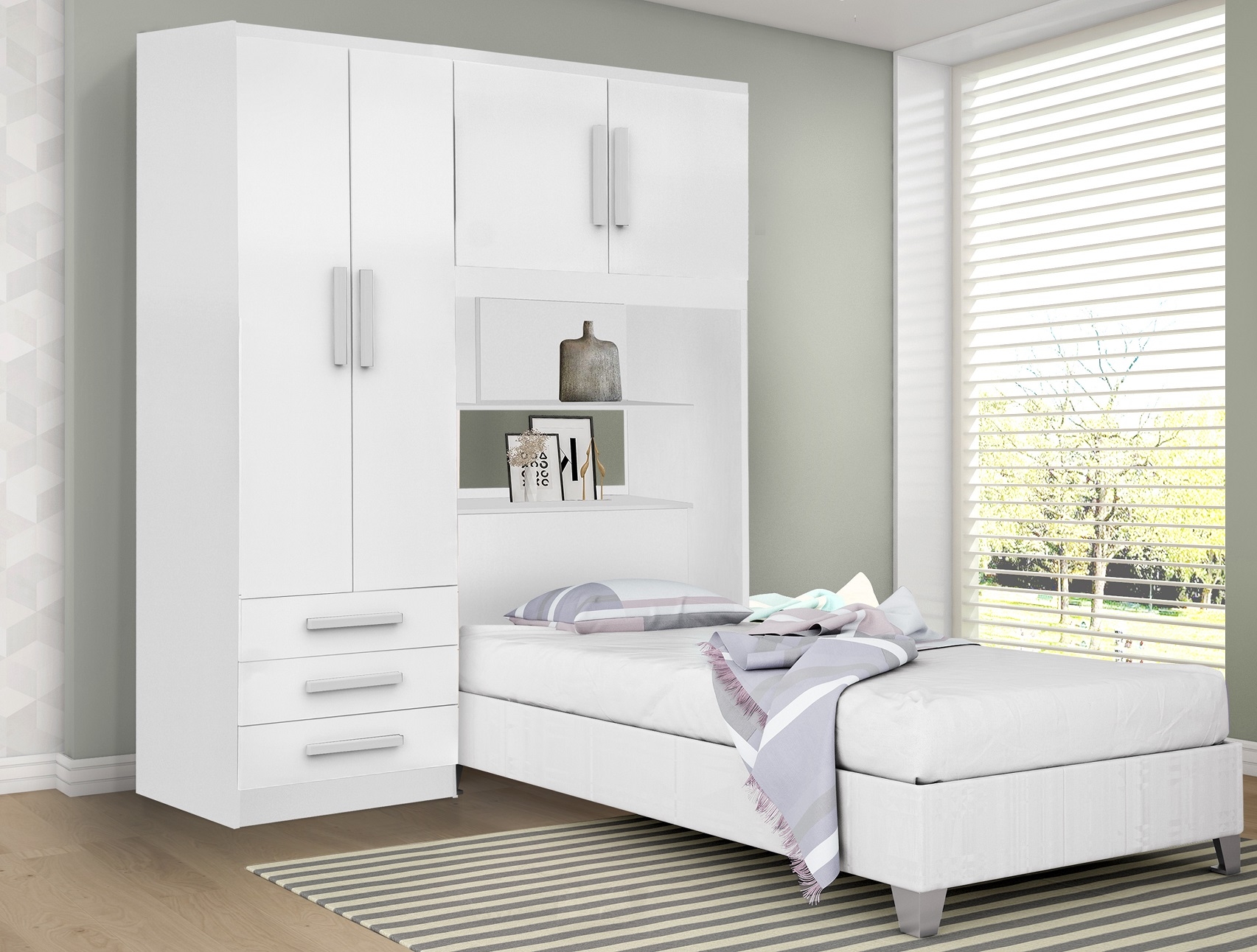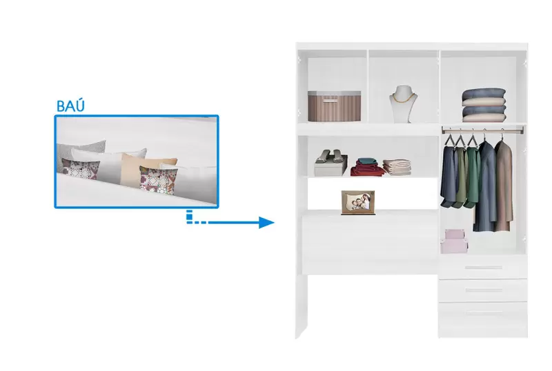 ALT 200CM – LARG 156CM – PROF 46CM – Puxadores em PVC – Cabideiro em Alumínio – 03 Gavetas com