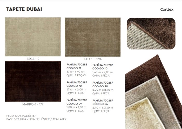 Tapete Dubai, Cores: Bege, Marrom ou Taupe, da Corttex, Medidas: 1,40m x 2,00m, Felpa 100% Poliéster, Base: 56% Juta, 30% Poliéster e 14% Látex – Antiderrapante.